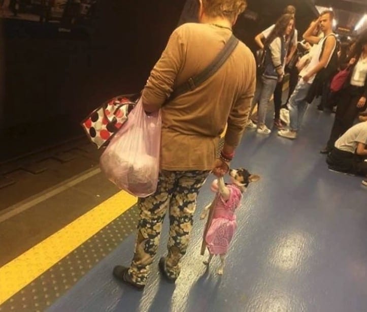 It’s not uncommon to see dogs on the platform of subway stations, but what is uncommon is to see a dog holding its owner’s hand. Sure, they are sometimes taught to give their paw for a treat, but we’ve never seen a dog walk along on its hind legs like that.