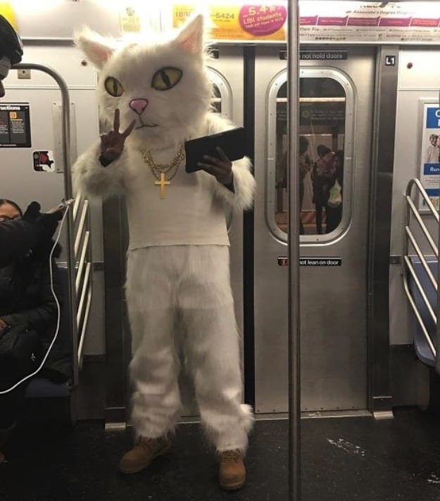 The more you look at this photo, the weirder it becomes. By this point, we’re not too taken aback by the giant cat that’s standing in front of the subway doors. What is a little odd is that this cat is not your ordinary cat.