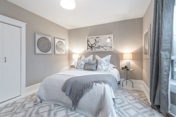 Rather than decking this second bedroom in white paint, Meghan opted for a similar look to her own master bedroom. The rug is the same, and the gray walls make it look homely, without looking too dark. She’s also finished this room with impressive pieces of art.