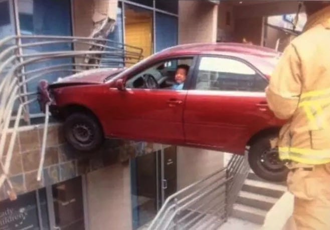 Clearly whoever was the behind the wheel wasn’t paying much attention and ended up driving through the railings. Either that or another careless driver forced them to swerve out of the way and into the side of the building.
