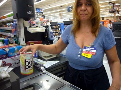This job has clearly become too much for this worker who can barely crack a smile during her shift. The irony is that at the moment this photo was taken, she was scanning an item with the word ‘hope’ on it. Perhaps she should buy some for herself.