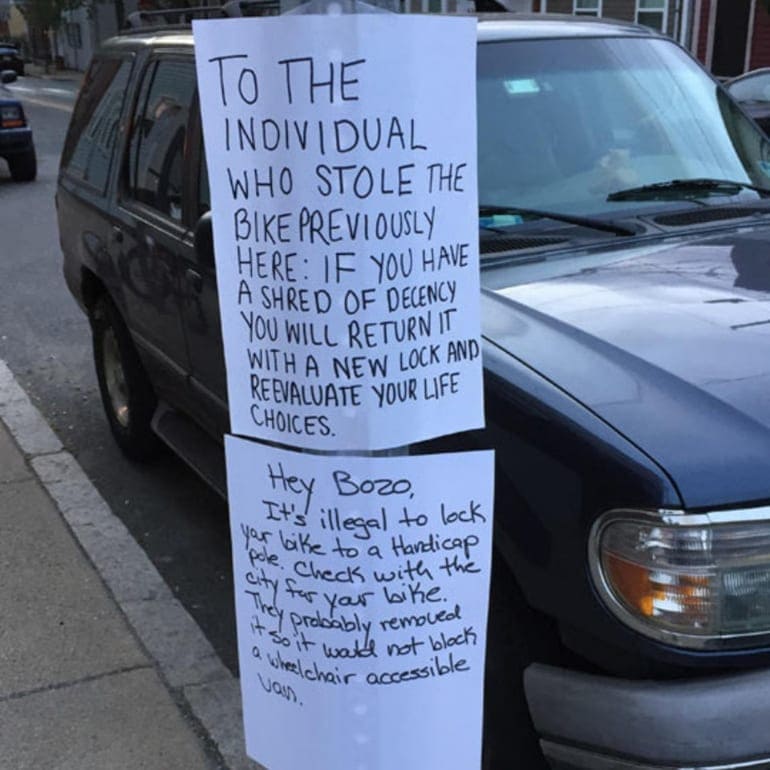 Then, after noticing someone had ‘stolen’ their bike, they left a note appealing to the ‘thief’s’ decent side. It turns out it was their lack of common decency that caused their bike to be removed in the first place courtesy of the city.