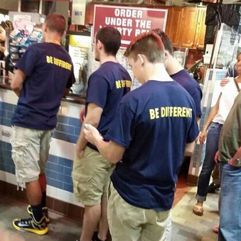 Not only are they all wearing the same shirt, but they’ve all got the same beige cargo shorts to complete the look. At least if one of this flock gets lost they know how to describe their friends to the police, all they have to do is look in a mirror.