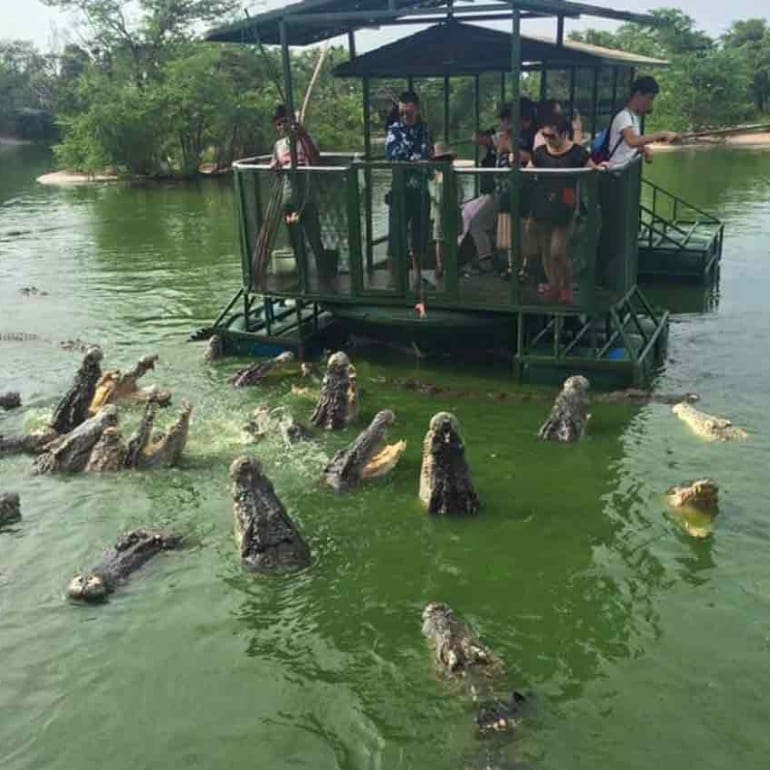 If you’re going to play the dangerous game of feeding crocodiles, alligators, or any dangerous animal, you need an escape plan. These people feeding the crocs are pretty much marooned on that little island, and at some point, their food is going to run out.