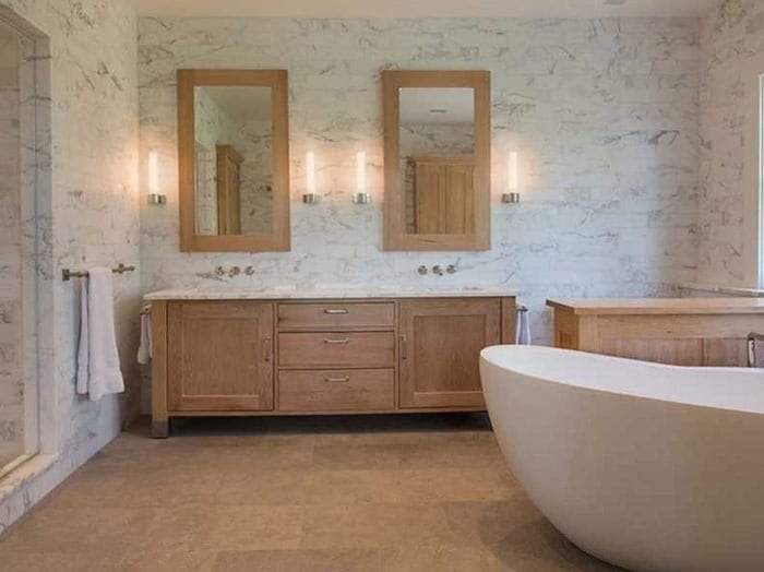 One of the many bathrooms of this mansion is incredibly modern, with marble-patterned walls and a beautiful blend of glossy white and wooden furnishings. A huge walk-in shower sets this house apart from your typical home.