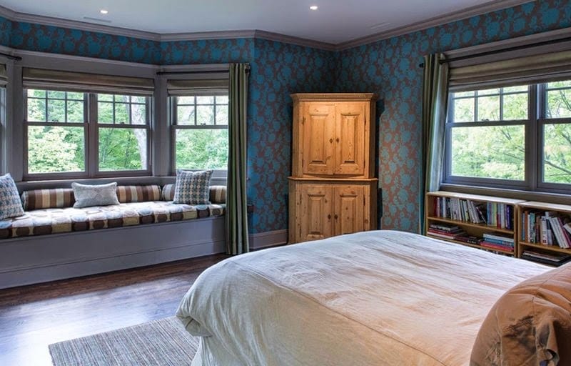 This bedroom is much more familiar than the last – that is, of course, unless you also live in a divine mansion. This room is much cozier, with darker wallpaper and a window seat.