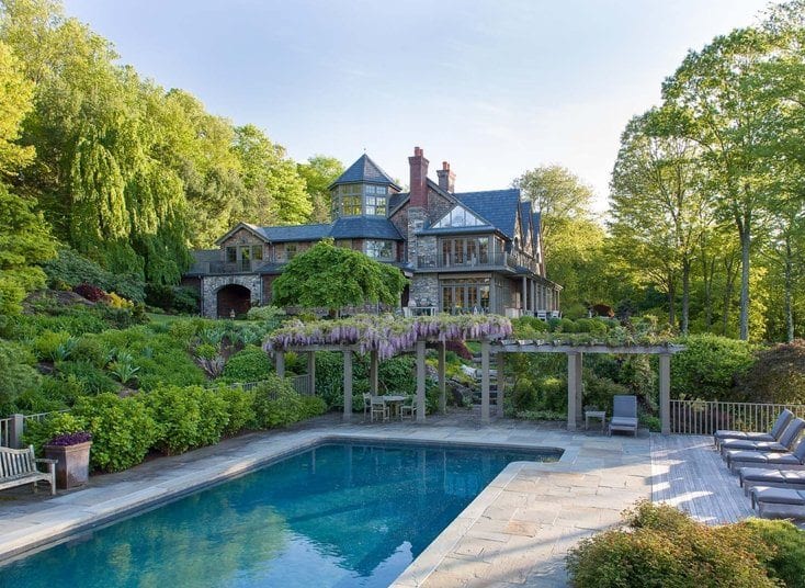 The backyard is just as beautiful as the front of the house. Surrounded by greenery and plants, the back of the house has a truly wonderful feel. A pool and seating area are in the center of the landscape, with a lovely view of the mansion.