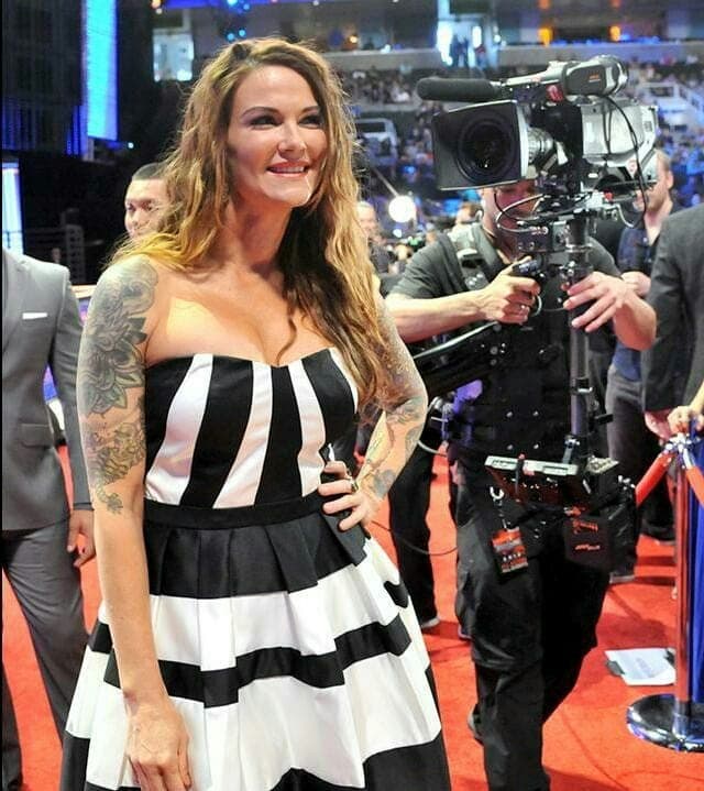 In fact, this picture here is at a WWE Hall of Fame banquet, and Lita is wearing a radical black and white striped dress that shows off her arm tattoos. She seems really happy in this picture – something we love to see as wrestling fans.