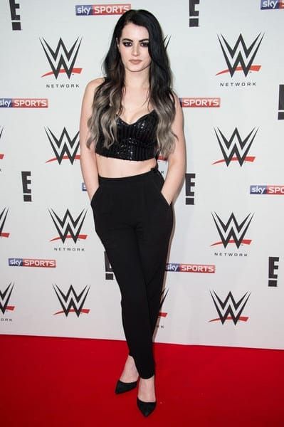 Also an actress, Paige recently appeared at this WWE Raw Pre-Show Red Carpet Event wearing an outfit involving long black pants and a glittering black top, the whole thing complimenting her jet black hair.