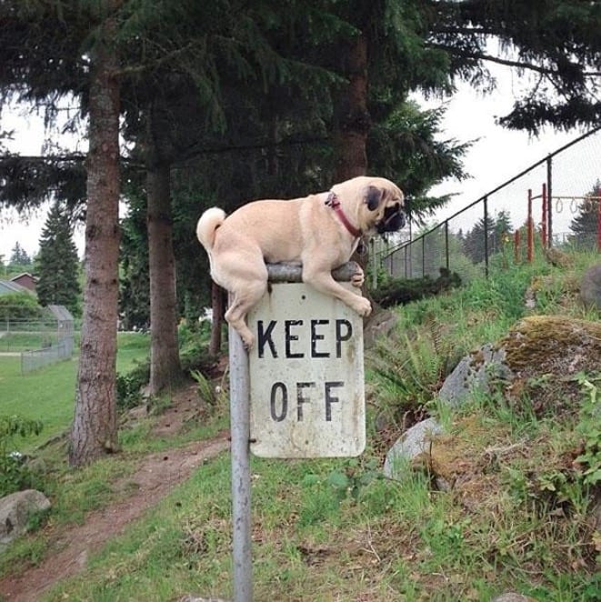 This adorable pug is brazenly defying this sign in the most literal way possible. He is perched precariously right on top of the sign, and seems like he is holding on for dear life.