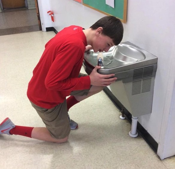 However, this tall young man can’t simply bend down and take a sip – he had to go through a much more elaborate process. He was forced to get down on his knees for that tasty sip. It looks like it was worth it.