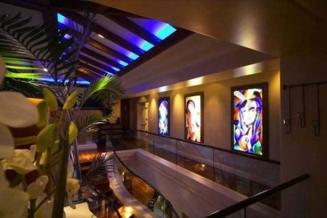 Instead, he has found a way to display some of his favorite pieces no matter what time of the day it is. This shot is a perfect example of how high the ceiling in this room is as the tree from downstairs is taller than the handrail.