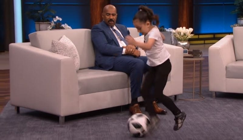 Steve couldn’t just mention the Neymar move, now we all wanted to see what this move was. Ariana recovered from her tears pretty quickly and got up from the couch and took control of her soccer ball. She showed the trick to Steve, nailing it first time! Steve was so impressed he had to see her do it again, and she nailed it once again. Clearly she had been practicing that move a lot, and Neymar himself would have been impressed by it.