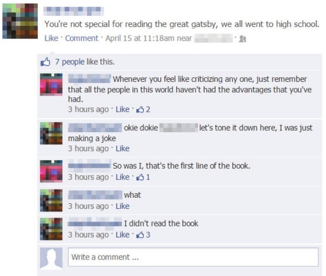 For whatever reason, this guy decided to talk about how everyone had read this particular book, but proved himself a liar when someone quoted the first line of the Great Gatsby and he had no idea what they were talking about.