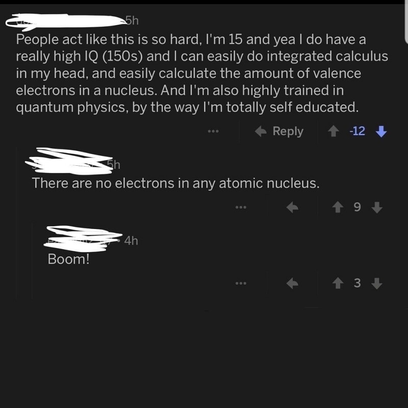 This poster tried to play themselves off as a young science prodigy, but it all came crashing down when someone realized one of their braggadocious claims was completely false. Maybe time for a bit more self-education.
