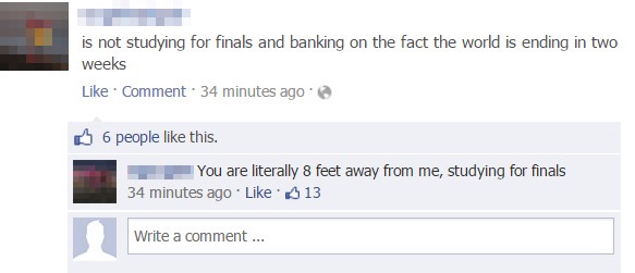 One student said he wasn’t even going to try this year. He posted saying that he wouldn’t study, and that he would just pray the world ended before his tests. He might have just been trying to look cool because someone caught him actually studying and called him out big time for his lie.