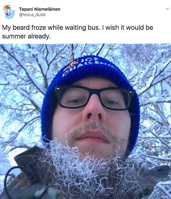 Along with people’s hair sticking out in all kinds of weird places, you have people like this, with beards that resemble snowy bushes. According to this guy, his beard froze while he was waiting for the bus! That means not only are things exceptionally cold… they are making things freeze at a crazy fast pace.