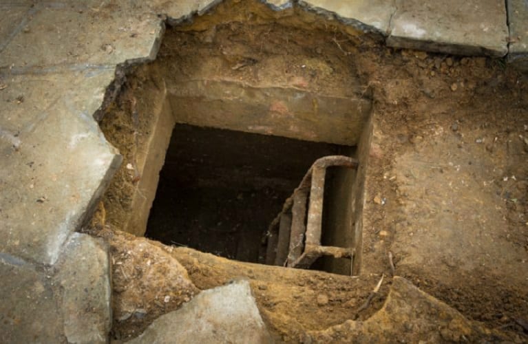 As they buried their shovels deeper in the soil, Simon suddenly heard a clang. As they pushed away more and more dirt, they saw a rusty old ladder. They were sure now that the hole was human-made, and it must have been built here under his driveway for one reason or another.