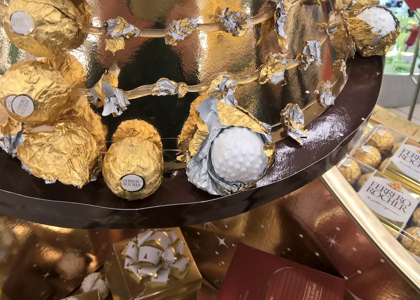 The ones that are lined up and stacked in pyramids on the countertops are fake. The balls are made of styrofoam and wrapped in Ferrero Rocher’s signature gold wrapping. So if you reach for one during Christmas, don’t say we didn’t warn you!